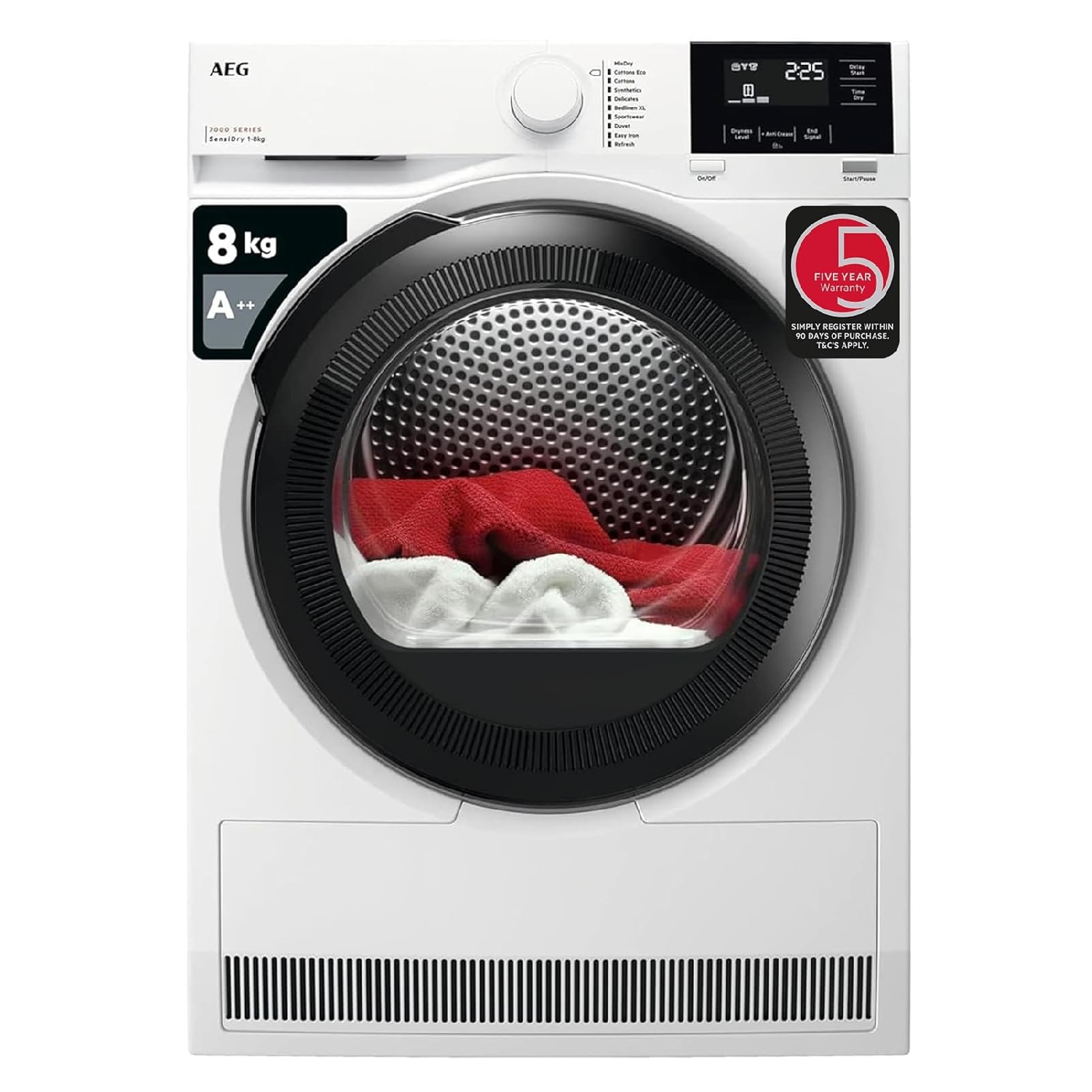 - GENTLE DRYING AT HALF THE TEMPERATURE. NO COMPROMISE ON RESULTS – The 7000 SensiDry 8kg Tumble Dryer uses heat pump technology. It dries clothes evenly, at low temperatures, without extending the drying time. Gentle drying ensures items are never subjected to unnecessary heat, so your clothes last longer. To qualify for the free Extended Warranty to 5 years in total, you are required to register the Appliance on aeg.co.uk/5YearWarrantyClaim within 90 days of purchase.